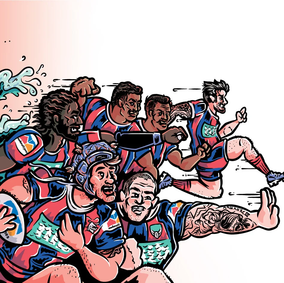 Wraparound cover illustration for the Newcastle Herald celebrating the Newcastle Knights entering the NRL Semi Finals. The illustration features depictions of Kailyn Ponga, Edrick Lee, David Klemmer, Jacob and Daniel Saifitti and Mitchell Pearce. They even interviewed me about my lack of football knowledge, which can be found here.